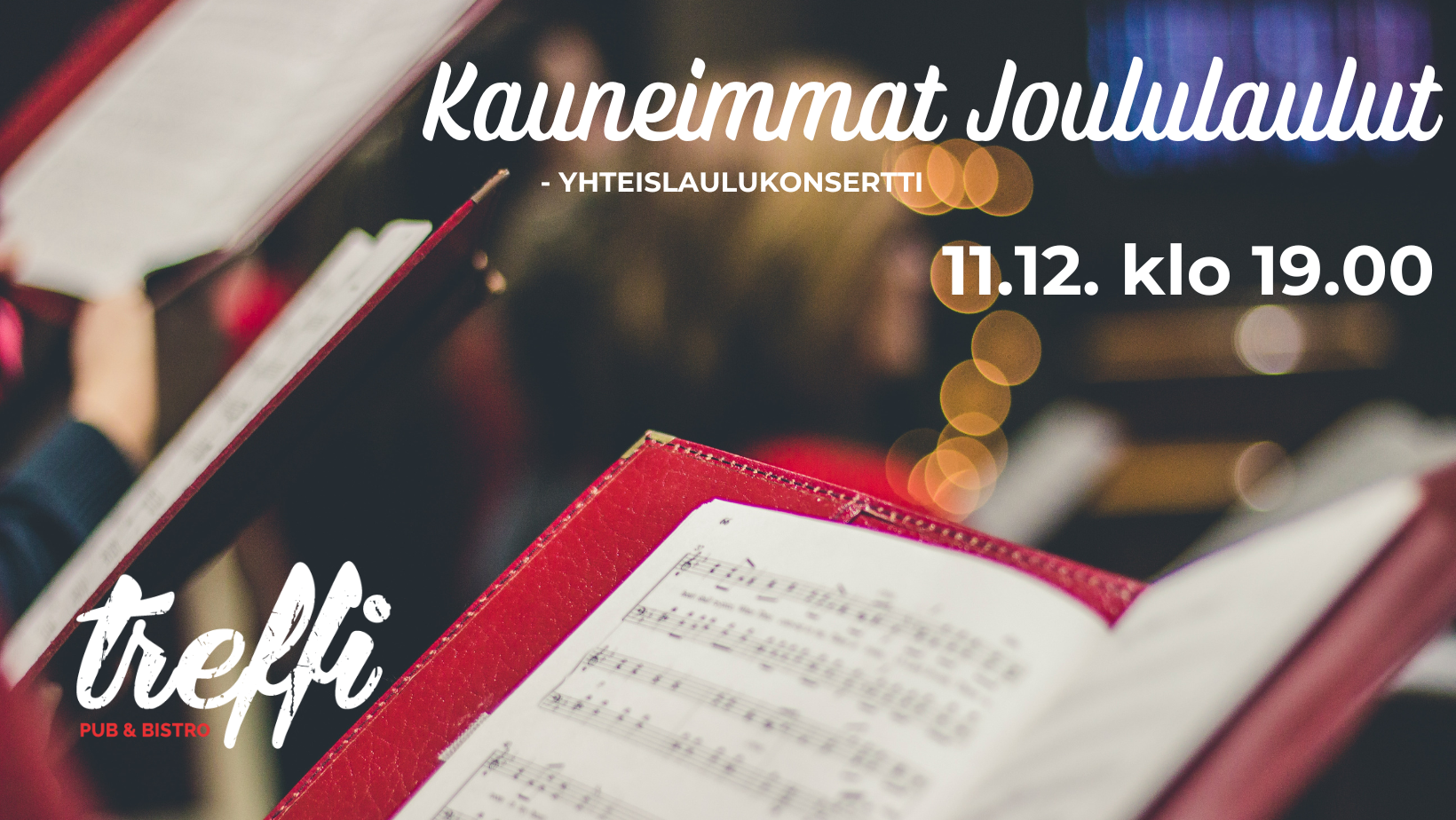 Tervetuloa nauttimaan tunnelmallisesta joulun odotuksesta suositussa Treffin Kauneimmat joululaulut -yhteislaulukonsertissa maanantaina 11.12. klo 19.00! Henna Dolkin ja Tommi Vikstenin johdolla laulamme joulun ikivihreitä sävelmiä. Luvassa